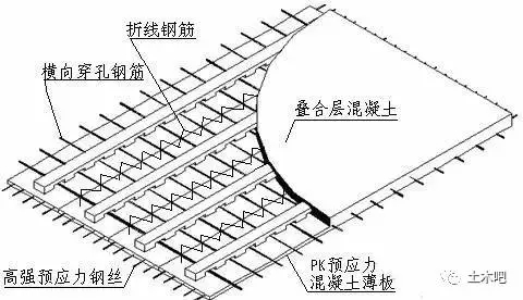 PK叠合板以倒“T”形预应力混凝土预制带肋薄板为底板,肋上预留椭圆形孔,孔内穿置横向非预应力受力钢筋,然后再浇筑叠合层混凝土从而形成整体双向受力楼板。