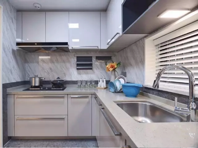 柜体与墙体预留挂件,契合度高;胶衣台面耐磨、抗污、抗裂、抗老化,无放射性;整体厨房全部干法作业,现场装配率200%;无需排烟道,节省厨房空间。
