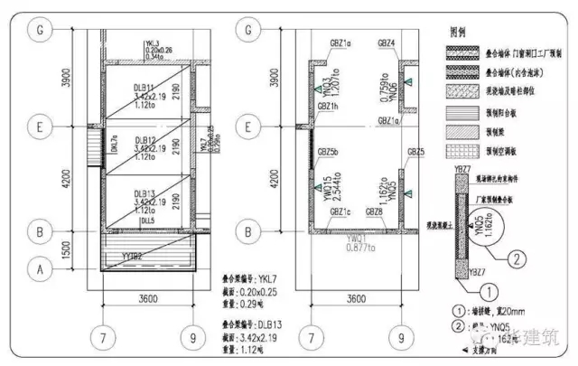 预制构件的平面布置图、立面布置图,通过不同的填充图例对预制构件与现浇段进行区分。平面布置图中详细注明了构件编号、尺寸、重量、支撑方向等,同时还示意了叠合楼板拼缝位置,水电预埋位置等,为现场施工提供可靠的数据支持。