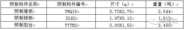 C)预制构件的大小考虑工程的合理性、经济性、运输的可能性和现场的吊装能力。对于4#楼出现的预制构件的最大尺寸及重量统计如下表。