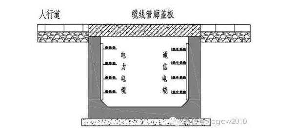 缆线综合管廊一般埋设在人行道下,其纳入的管线有电力、通信、有线电视等,管线直接供应各终端用户。其特点为空间断面较小,埋深浅,建设施工费用较少,不设有通风、监控等设备,在维护及管理上较为简单。