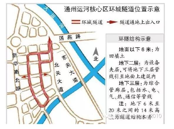 北环环隧位于北京市通州运河核心区北区,环隧主体全长为1.5公里,设置4对进出口(4处进口、4处出口)。主隧道按单向1车道布置,两侧布置多功能车道。其功能定位主要为地下车库的交通联系通道,设计车速30公里/小时。主体结构从上至下依次分别设置行车道层、综合管廊设备夹层、综合管廊。