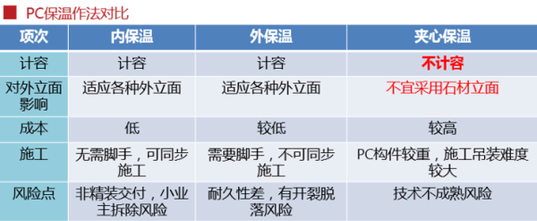 装配式建筑对很多现有的建筑做法都有不同的影响,其中,对外墙保温做法和石材立面做法的影响最为明显,下面两张表清楚地对比了各种做法的优缺点、成本和施工因素、适用性等方面。