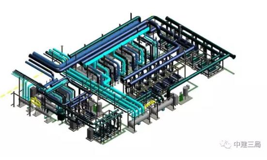 传统机电安装与土建施工交叉进行,只有土建提供相应的工作面,才能进行机电的深化设计和安装。对大型冷冻机房安装这种工程,土建很多时候只能分步提供场地,这就给机电设计人员出了大难题:因为各部分设备、管道、支架、构件的走向、标高、尺寸没办法一次性完成测量,设计人员就只能量一段、做一段,分段深化、分段下料、分段加工、分次运输、分段安装,效率极低。