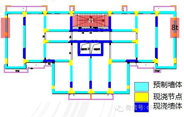 标准层:外墙板22块,内墙板13块,叠合板46块, 8t预制悬挑构件11块,其他预制构件10块,共计102块,其中外墙板为挤塑聚苯板复合夹芯板,最大构件重量为8t,楼梯为4t。现浇混凝土用量63.46m³。