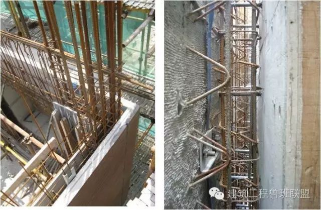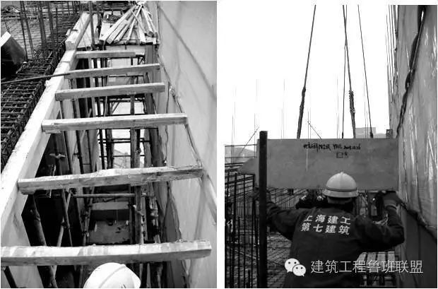 阳台板下设排架支撑(左)预制阳台起吊(右)