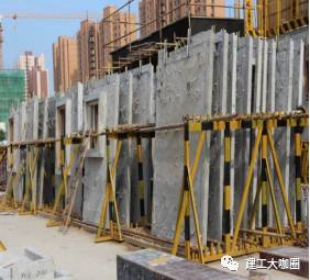 预制外墙板宜采用堆放架插放或靠放,堆放架应具有足够的承载力和刚度,预制墙板外饰面不宜作为支撑面,对构件薄弱部位应采取保护措施。预制墙板采用靠放时,用槽钢制作满足刚度要求的三角支架,应对称堆放,外饰面朝外,倾斜度保持在5°~10°之间,墙板搁支点应设在墙板底部两端处,搁支点可采用柔性材料。堆放好以后要采取临时固定措施