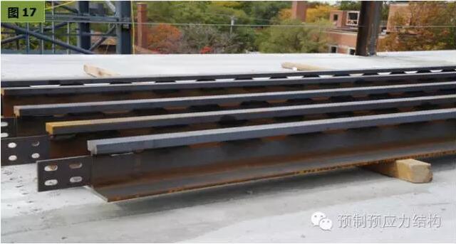 核心技术是用半个标准H型钢改造后将预应力空心楼板放在梁底。然后在现场灌浆而形成一个迭合梁(图1、4、5、10、17)。这种钢结构住宅体系的优点是它几乎如同混凝土的板式结构(图10、12、13、16)。和现有钢结构主宅仍保持传统的主次梁结构(图34)建筑工业化相比,在防火、隔音、振动、降低层高,自由隔间而言,有其绝对的优势。而针对国人对住宅的要求而言,Girder slab系统更接近混凝土系统。从住宅主结构而言,国内现有所谓最新的钢结构体系也成为十九世纪的产物。