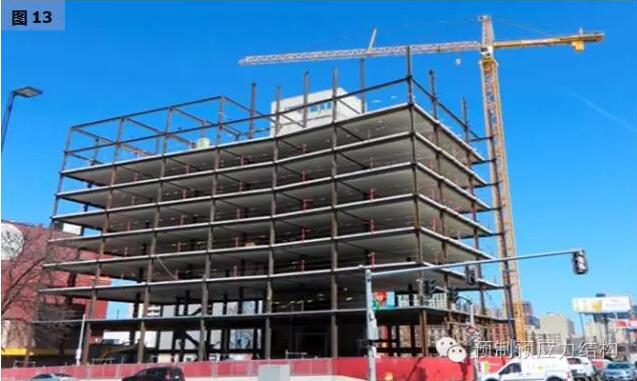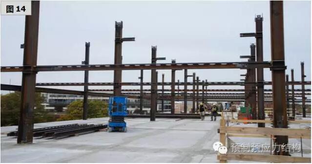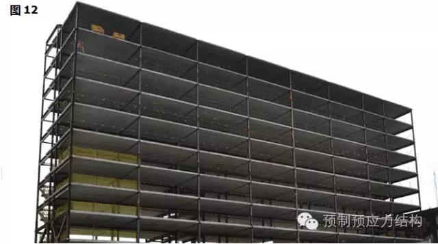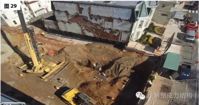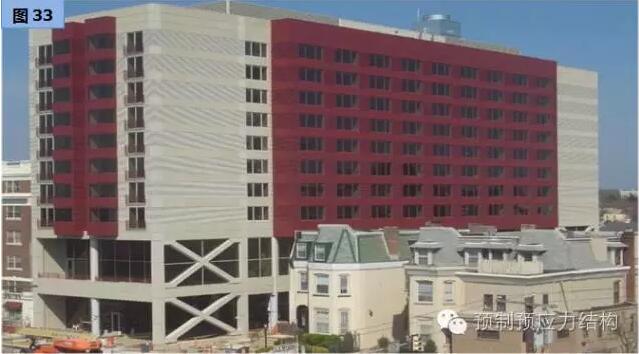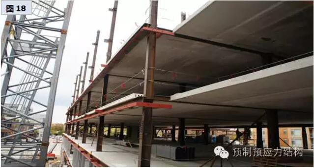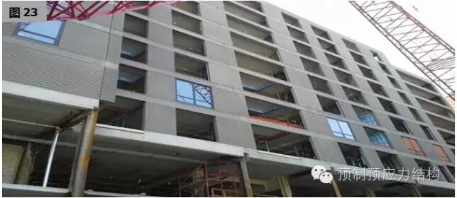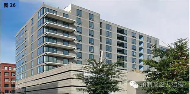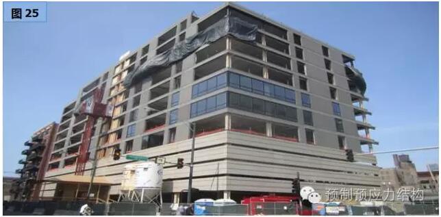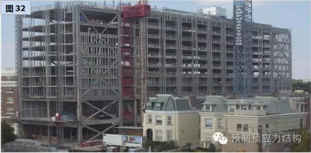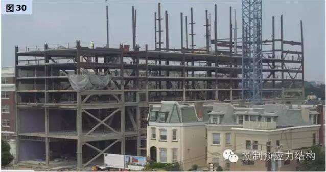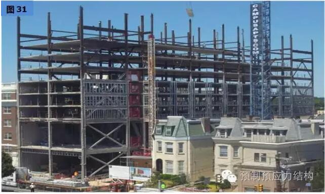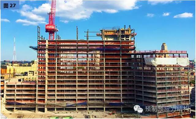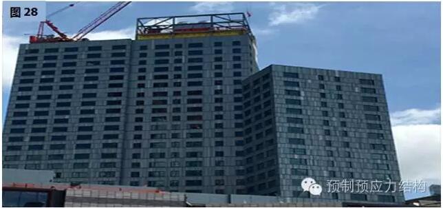 图27、28是美国东海岸某一城巿二十八层多用途建筑。图29至32是用于旅馆的工程案例。从图29可以见到工地的限制,而其他图片也充份表现出全装配干连接混合结构文明施工的可行性。