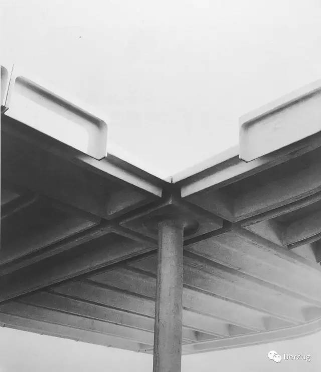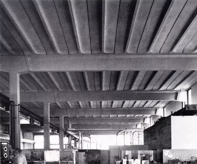 一系列平和但微妙的形式操作——从8m长的预应力板过渡到14m净跨的预应力大梁,再交接于微微扬起“承接”的柱头,最终以舒缓的柱身收分落地,柱头的出挑减少跨度内梁的长度(14m是当时卡车运输限制),梁板上曲线内凹刻画在保持结构强度的同时减轻了结构自重,板的微拱同时解决了屋面排水,而尽端柱头不承托梁的槽口则自然形成了排水的出口。举重若轻的轻盈优雅,毫无多余要素的高度整合,与工业建筑中常见的建筑氛围形成强烈反差。这里对材料的运用固然极大程度地彰显了浇筑工艺赋予混凝土材料的形式自由,但其核心价值却在于营造美的氛围。