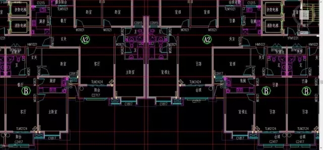 在工作中我们经常会遇到一些这样的项目:单元对称的住宅楼,左右多称的办公楼等等。在CAD绘图过程中,往往会遇到一些麻烦。比如想节省时间,只绘制一半,将房间名称、尺寸标注等成块后镜像,但是成块镜像后,字体也镜像了。如下图: