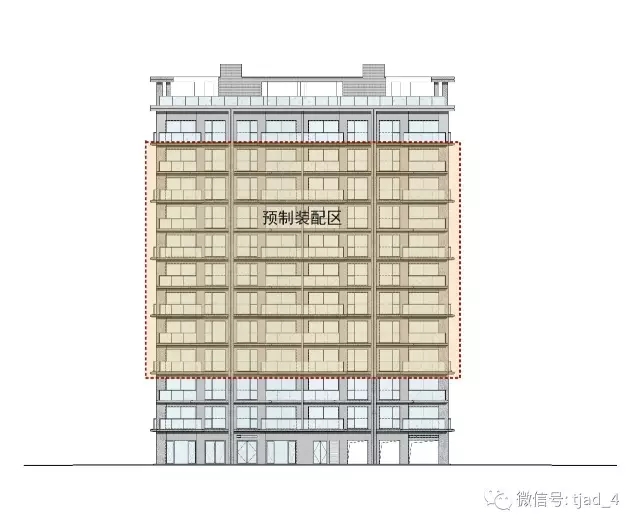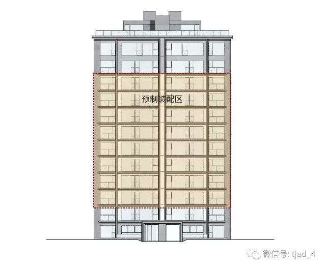 预制构件的立面分布范围如下图,底部加强区和顶部退台层采用现浇结构,中间8层标准层采用预制结构,立面覆盖率S=66.7%>50%。