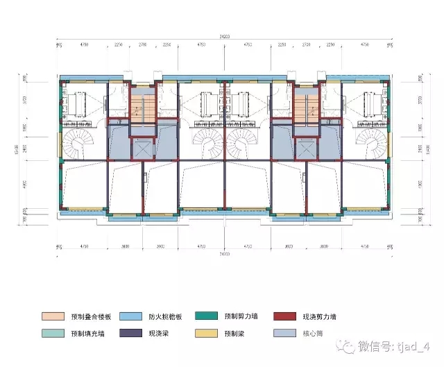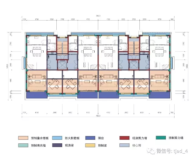 4,5号楼均为复式户型,奇数层平面开大洞除周边为叠合梁外,楼板和内部梁均为现浇;偶数层部分区域采用叠合楼板,预制构件平面分布如下,单体预制装配率25.8%>25%