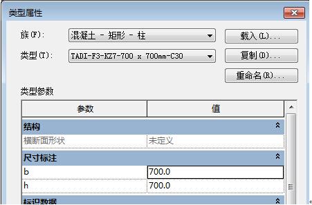 此项目构件命名分为5段制,如混凝土柱模型为TADI-F3-KZ7-700X700-C30(见图一)