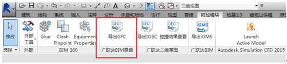 用REVIT软件打开该模型文件,利用附加模块中的导出GFC按钮,将REVIT模型导出为*.GFC格式的算量模型文件。