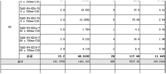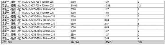 在两份工程量汇总统计中,柱子根数统一,同为486根;混凝土体积分别为1442.47m?和1441.43m?,REVIT比GFC稍大。应该是广联达软件在结构柱与楼板的重合部分进行了扣减。