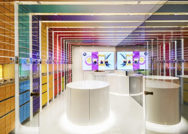 一侧墙面及顶面的胶囊盒子,通过半透明镜面的反射,使整个空间都被包裹在胶囊的明亮色彩中。空间中部则是如雕塑基座般纯粹的圆柱展台。