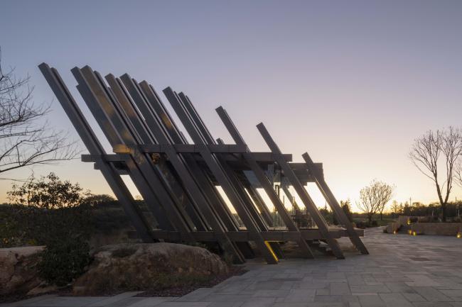 体验馆富有张力、直抒态度的建筑风格,同景观中曲折、平缓的意境融合相间,简练直接不失细腻委婉。十字形体寓意通过抽象的建筑意识形态,折射时代性格的建筑表达,象征时代浪潮的激荡翻腾,也正是其独特的魅力所在。