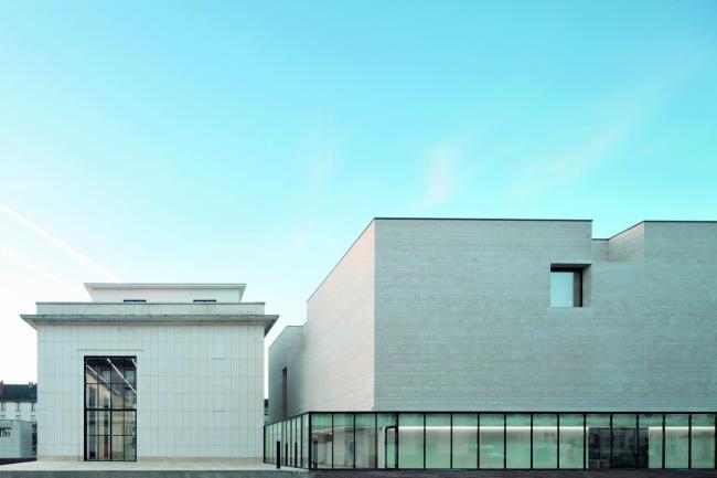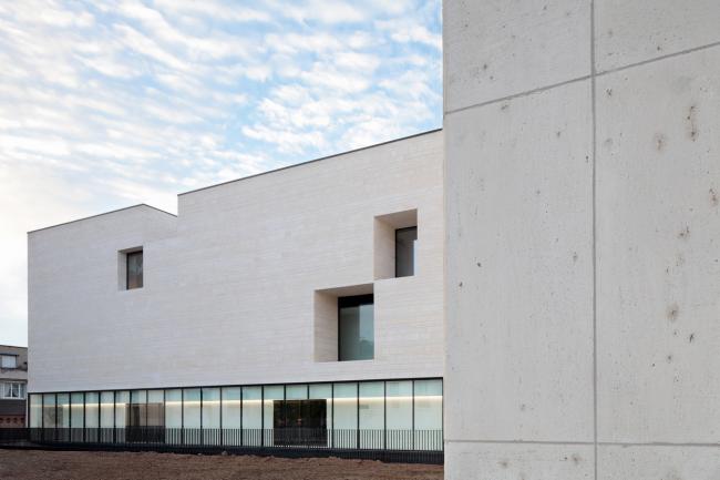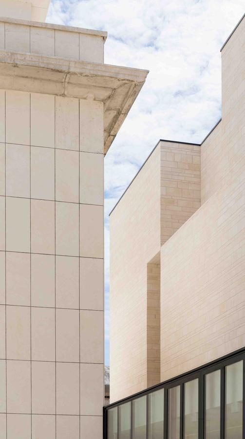 但是,它们的肌理是相称的,新建筑的白色体量和厚重的石灰石呼应着历史建筑的复原石板的色调。石材采用当地传统的石工技法施工,创造了属于场地集体记忆的景象。材料表现力的可能性经过推敲以加强其永恒感,重量感以及气质。建筑由石材建造,但是空间则由光线雕刻而出,提供了开放的,全新的功能的可能性。