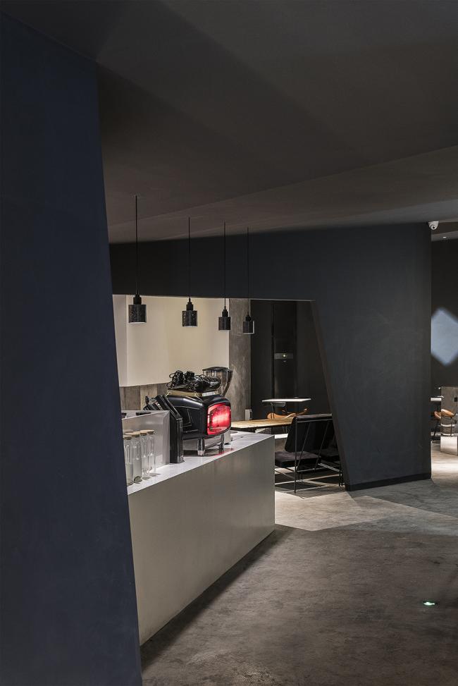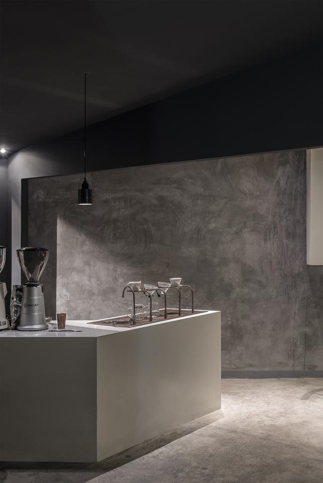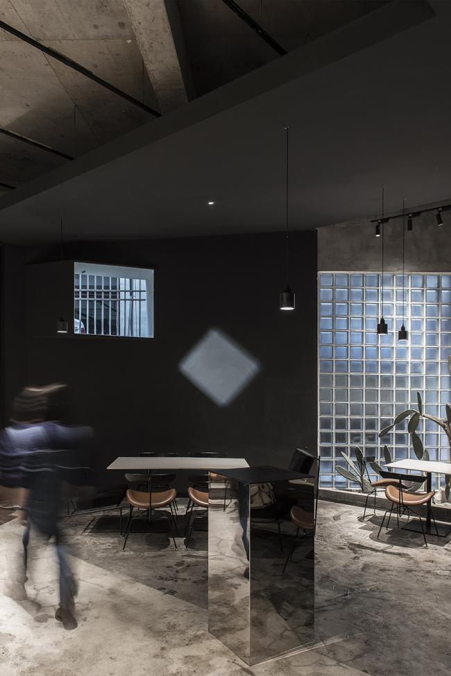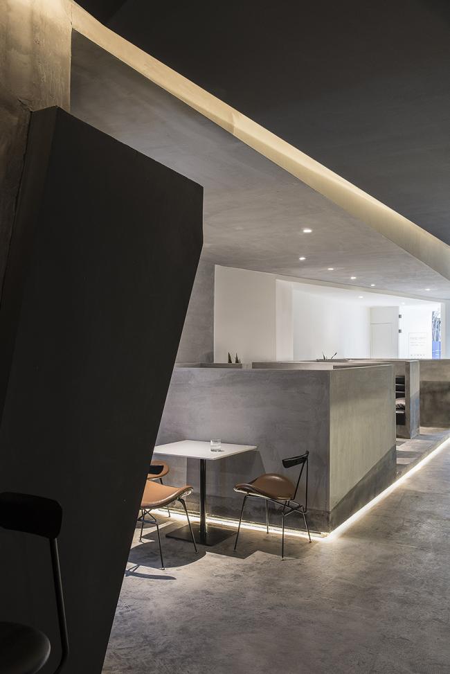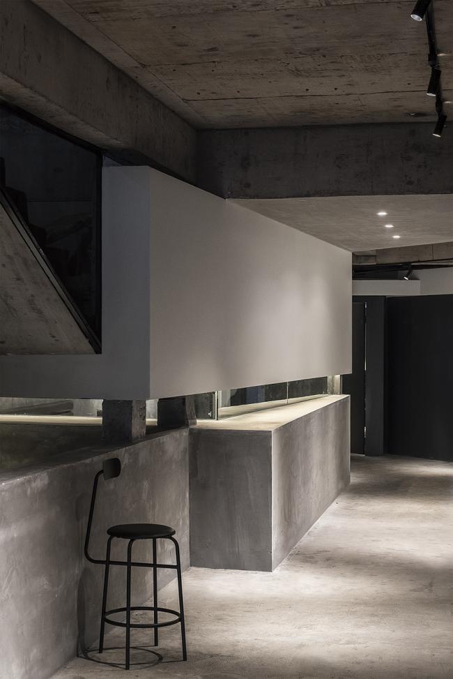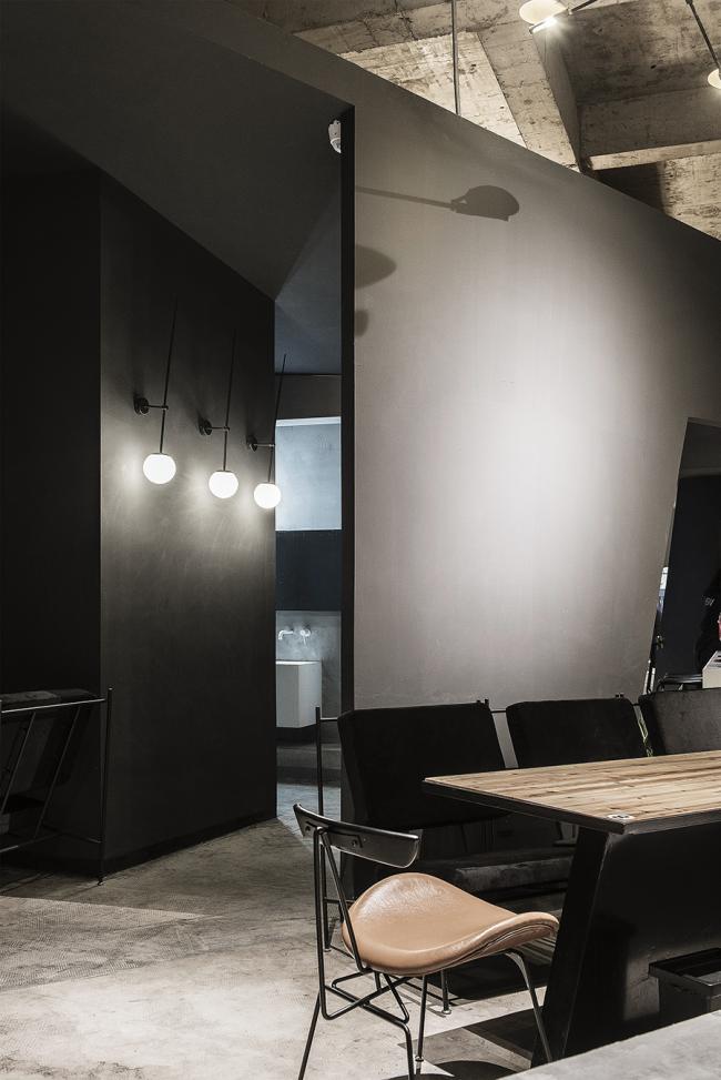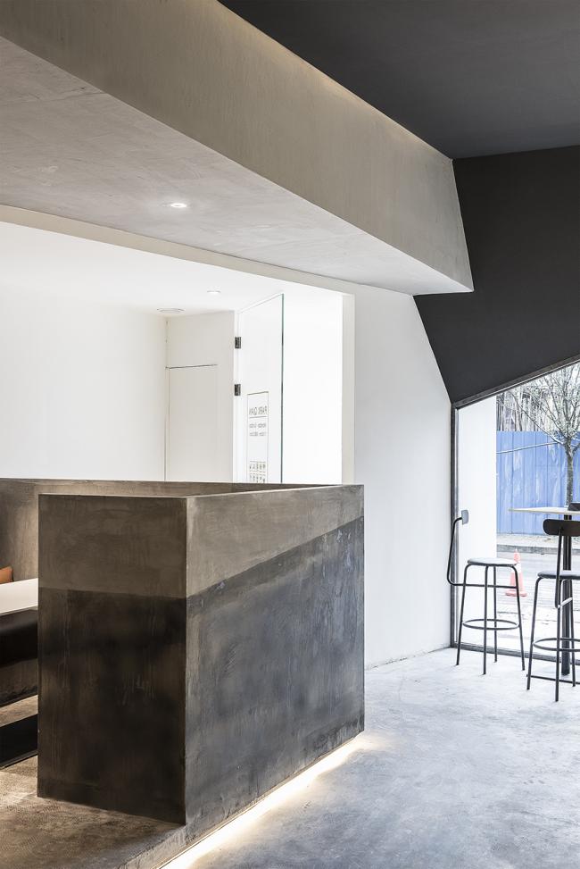 描述这座城市时,街角巷口中常见的灯红酒绿已然成为人们的视觉习惯,我们在构思彡口空间的时候就意将打破这种习惯,用暗调的黑白灰色来排布组织。完成后的沿街立面风格明确,所有的体块连接建立在房子本身规矩分布的矩形窗洞之上。轻微转折的斜面则在长向延伸的空间里切出流动的缝隙,节奏由上至下逐渐强烈。