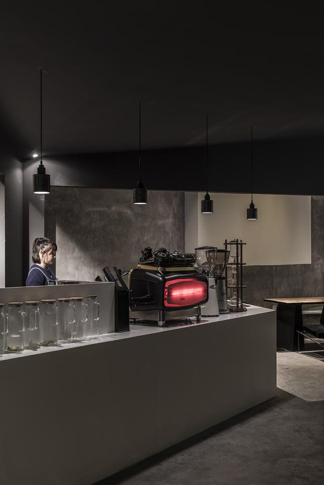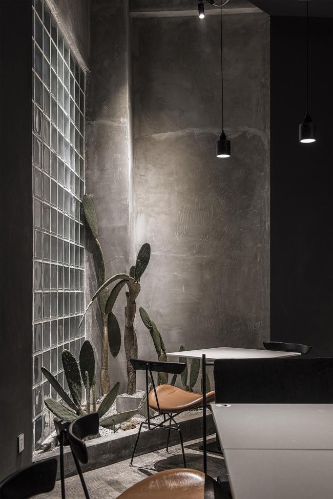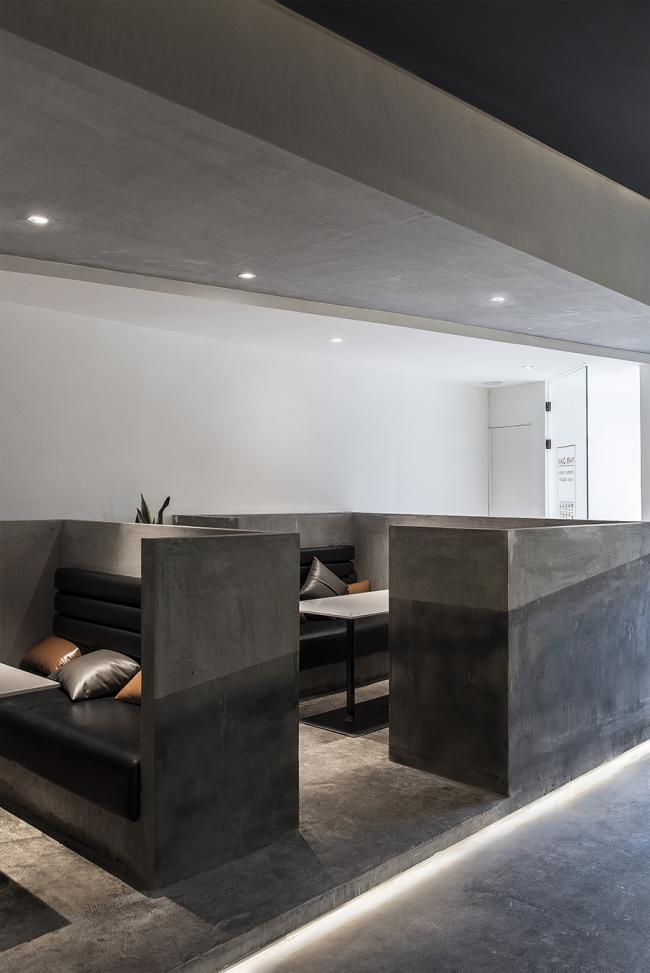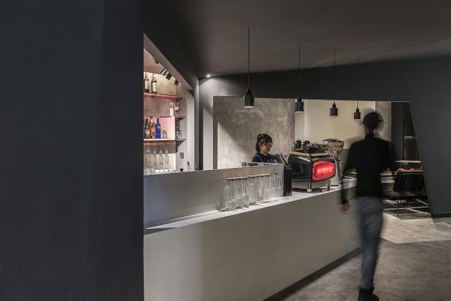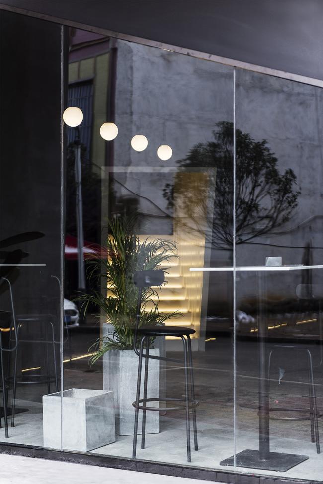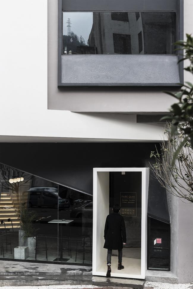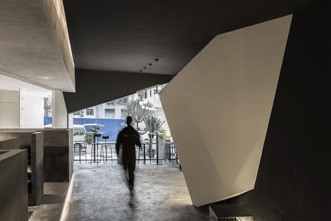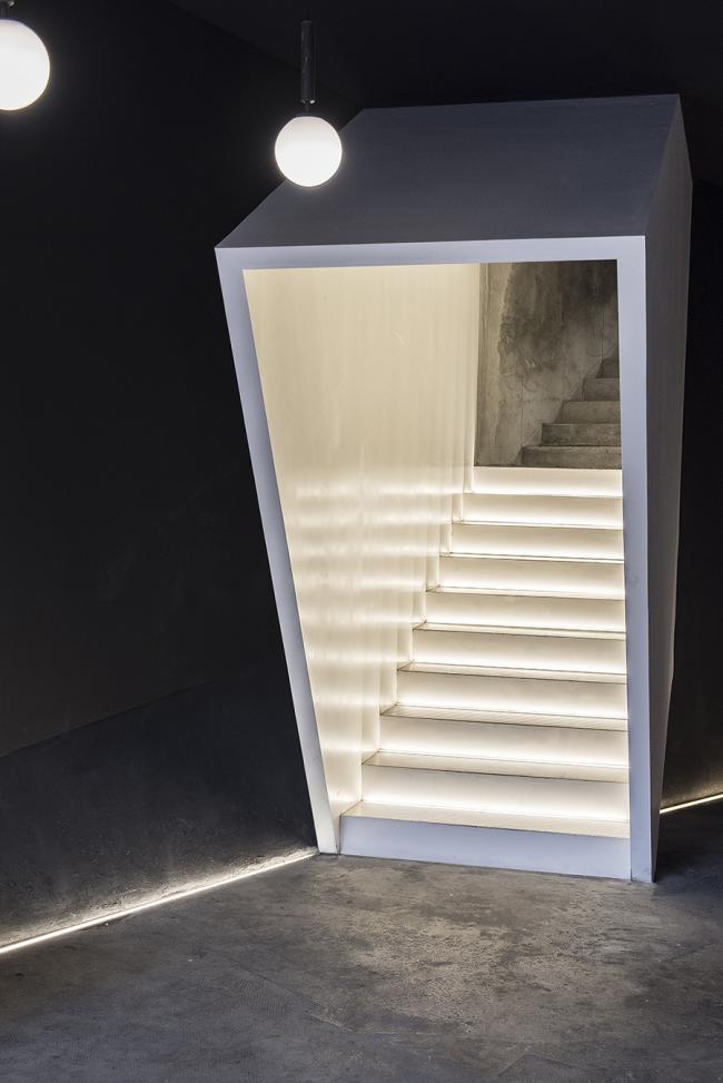 描述这座城市时,街角巷口中常见的灯红酒绿已然成为人们的视觉习惯,我们在构思彡口空间的时候就意将打破这种习惯,用暗调的黑白灰色来排布组织。完成后的沿街立面风格明确,所有的体块连接建立在房子本身规矩分布的矩形窗洞之上。轻微转折的斜面则在长向延伸的空间里切出流动的缝隙,节奏由上至下逐渐强烈。