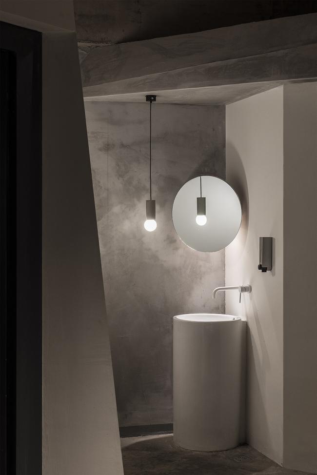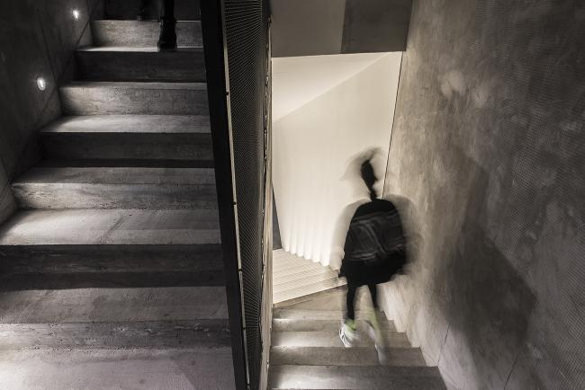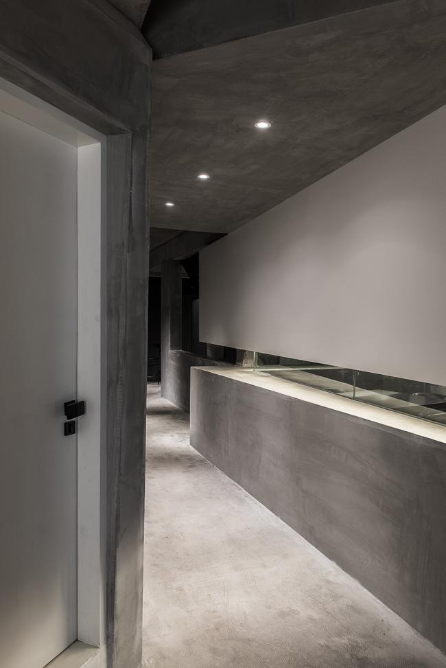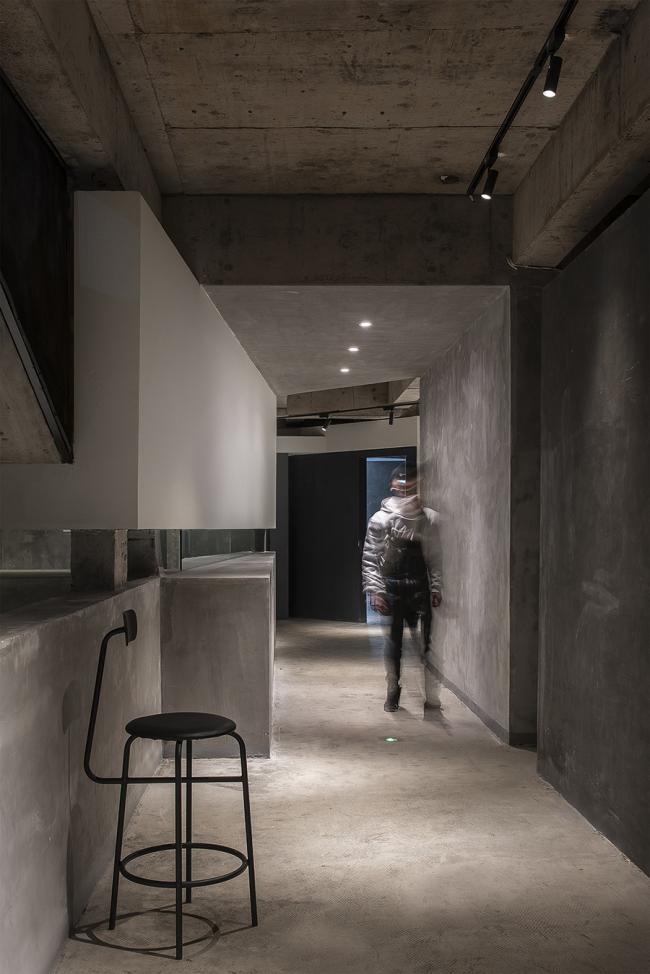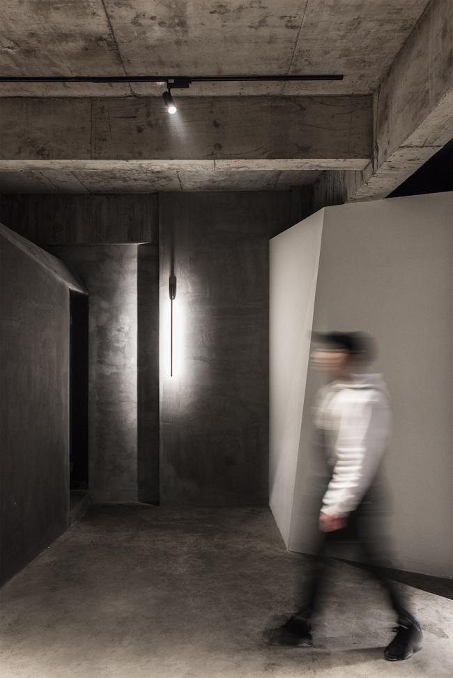 由白色交通盒子行至二层空间,承接整个设计概念中变奏后的空间氛围,墙体结构的斜切比例和首层略有不同,色调控制相对呈现中灰色。整个交通空间内没有自然光线引入,不同照度的灯光便至关重要。我们把私密性空间放置于两端,各个局部的斜切构造在交错连接时如同抽象的磐石伫立,而新建用材的质感又是相对轻盈平滑,这些偶然的冲突感组成了人们行走其中的空间张力。