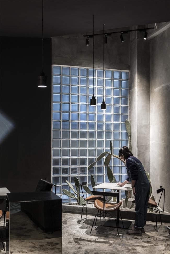 行进至中部,作为酒水软饮的空间,核心大吧台同样穿插于折叠体块之中,均衡服务两端顾客的同时,强行将空间阻隔,前后空间于此有了时差。目光所及到空间最深处,半透的玻璃砖和视错觉的窗洞阻隔室外杂乱的环境,同时设置在原始空间之内折叠体块之外的演艺台营造了一个更加丰富的就餐角落。