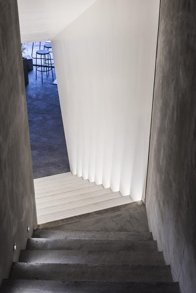街道两侧走来的人们探秘似的准备进入这个白色洞口,连接至室外的折叠体块有意将视觉时间拉长,推门进入,视线首先落在斜插于折叠空间内同样为纯白色的体块上,层叠光线和原始的粗粝感并置,形成通向二楼的交通盒子。所有的切面构成有些许失重重叠的特殊体验,夹缝中洒下的灯光也同时加强空间的雕塑感。