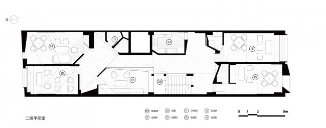 作为彡口品牌的初始阶段,整个建筑的改造重心放在外立面和一二层室内空间。功能构成也简单明确:一层为开放多变的餐区布置,满足不同场景的需求。二层则安排为大小功能不一的私密包厢,在满足当地消费习惯的同时,增加新的空间体验。建筑本身狭长的进深在采光和通风方面都有严重不足,此限制也让空间氛围本身带有神秘感和手工的粗颗粒。虽然这些直观感受是带有一定肆意为之的风险,但我们决定保留这些感受,让它在新的空间构成中穿插呈现,就像这个房子本身的底色,不可或缺。