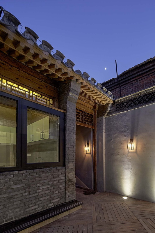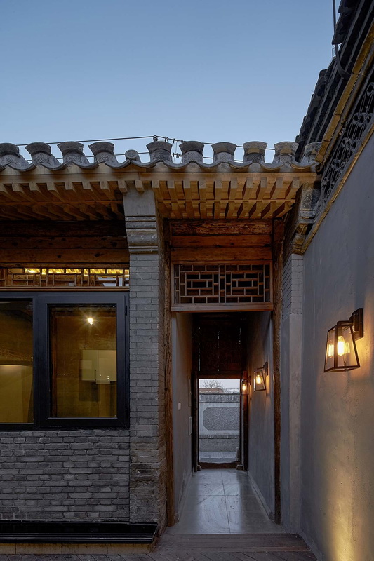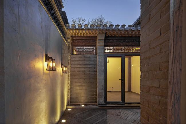 房间尽可能地与四合院中最美的庭院发生关联,光线通过宽大的落地窗辗转映射在这百年老屋的每一个角落;前厅大堂、厨房、客房、连廊、露台之间的串联转折,在露台远眺正阳门的夕阳美景也体现出传统造园的精髓。与城市街道接驳的入口保留了原有城市界面:从青条石台阶拾级而上,穿过修缮后的门廊,外面喧嚣节奏自然地转换到宁静的园林氛围里。