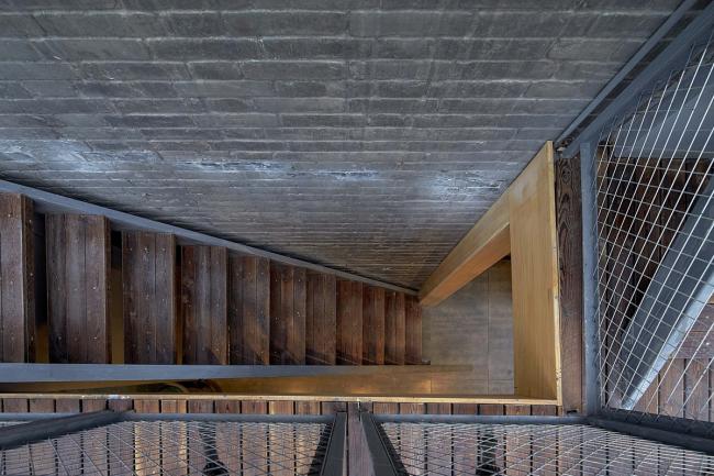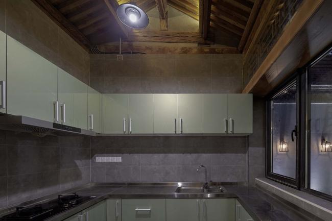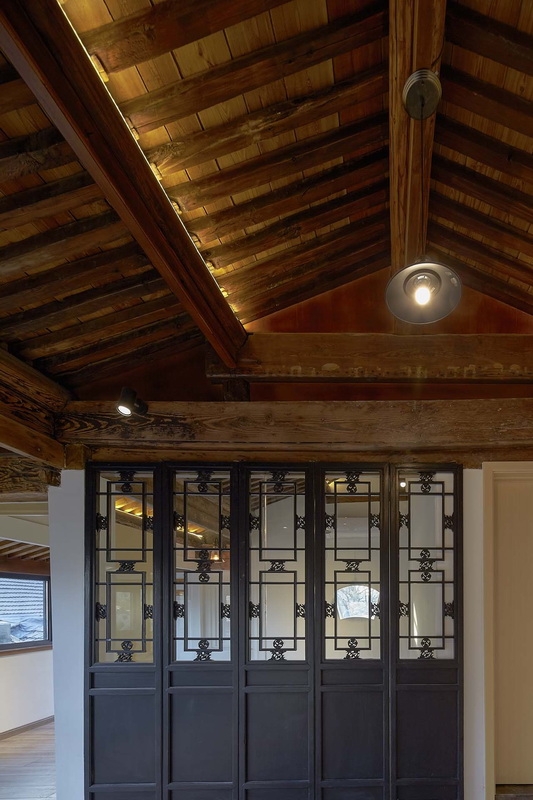 改造设计在内部空间材料的处理手法上简洁克制:原有的主体结构经过韧性好强度高的钢结构加固补强,谨慎的保留和裸露部分木架结构,形成新旧关系的融合。历经岁月变迁的老木板被打磨出固有的木质纹路,配合传统大漆工艺做的涂料工艺为整个空间贡献了安静而温暖的元素,展现出旧宅古朴素雅的气质。淡黄色的杉木和天然石材等自然材质也延续并强调古朴的氛围与气质。而搭配着断桥铝门窗的深色金属质感,却又为这古朴粗犷的氛围增添了一份精致的现代感。