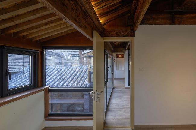 在西侧厢房与正房的邻接位置增设钢质楼梯,同时增设无围护的避雨(BIM学习)棚架,从而解构性地把首层到二层的新旧功能序列垂直性地串联起来,嫁接成为一栋庭院相间、内外相连的立体院落。通过局部增加外窗和采光庭提升了整体的自然采光及通风;同时扩展了卫生间的数量,既满足了初期办公使用的需求,也为后期民宿预留了充分条件。