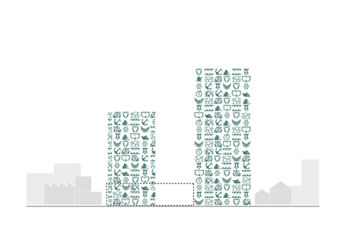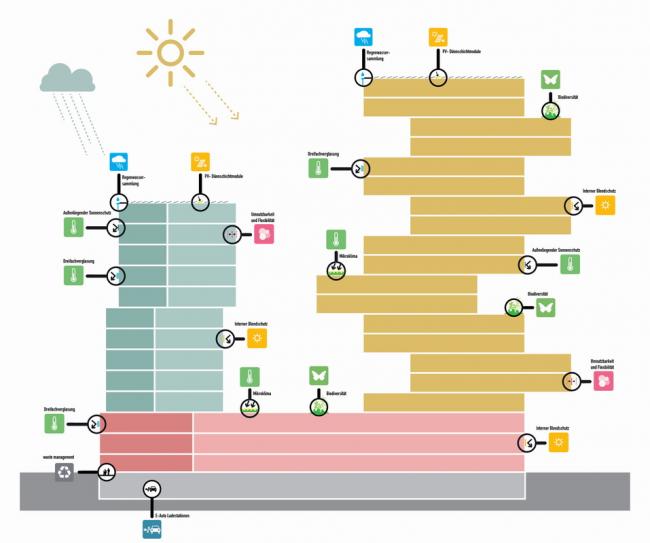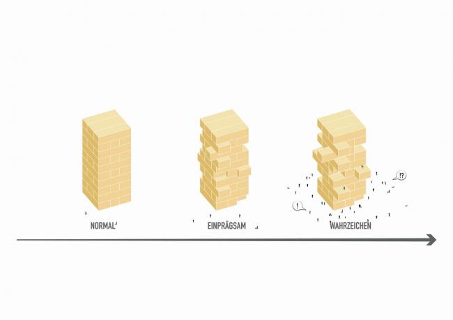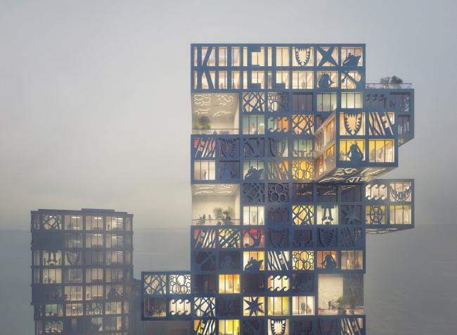 活泼的外部空间是该项目的关键:建筑之间的庭院充满了各种可供居民使用的公共设施,蜿蜒的屋顶花园分布在三个立方体住宅体块之间。由纤维增强混凝土制成的立面面板是该项目最引人注目的元素,它被置于窗前,向人们展示各种汇集当地居民创意的图像标志。