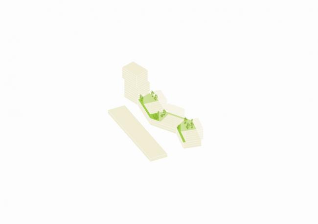 在MVRDV的方案中,W8媒体中心现有的结构将被保留并用于商业用途,其顶部还将加盖公寓。媒体中心旁,是一个具有折线形裙楼的建筑,裙楼包含办公和购物;裙楼上方的几个立方形体块将承担住宅功能,塔楼则将作为办公空间。场地的一端,包含250间客房的酒店大楼通过公共活动空间与上述裙楼相连,这个公共活动空间今后将用于举办社区组织的展览和活动。