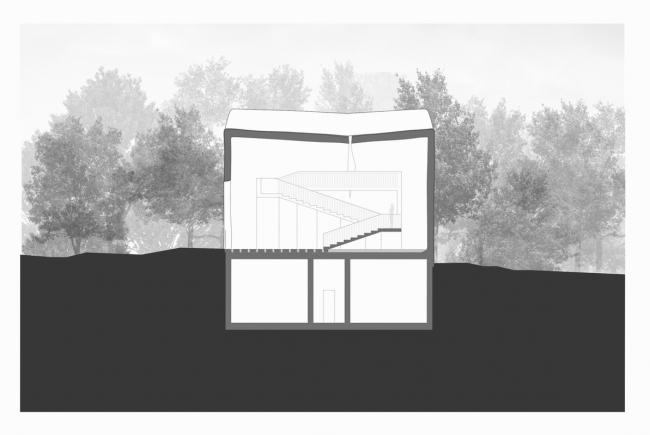 穿过一系列的石头阶梯,从一个螺旋楼梯通向观景平台,从这个平台可以看到工厂内三层通高的大型基础设施。你还可以通过立面上一个窄窄的开口看到周围林地的景色。