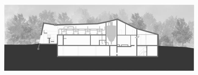 “这座建筑的作用是将独特的而又先进的技术联系起来并加以表达,将其置于自然生态系统中,强调净化过程的重要性,”建筑事务所解释道。屋顶上大面积的开洞将日光引入公共区域,与工厂内较暗的功能性空间形成对比。