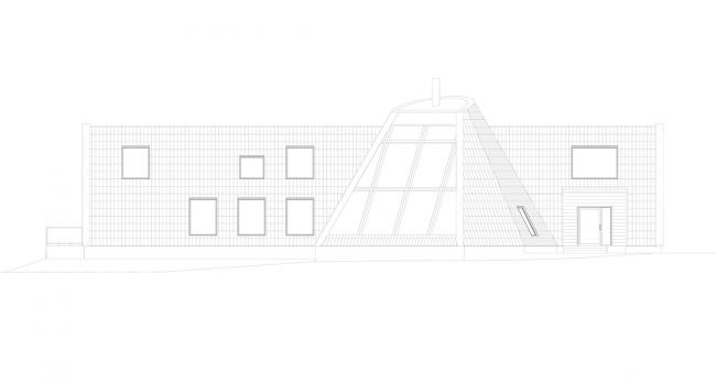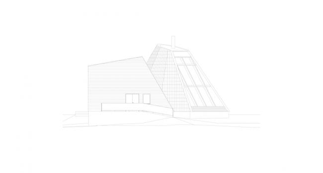 度假村的主要体量进一步发展和延续了这个风格形式的主题,两个简单的互锁体量相互叠加。主楼设有一个全通高的餐厅和休息室,全玻璃幕墙和全景阳台。第二个体快的特点是瘦长而倾斜的玻璃立面,其中包括接待处,办公室和其他技术设施等功能空间。