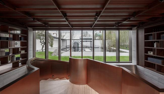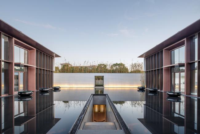 下沉庭院为满足会所的采光的功能需求,立面采用玻璃幕墙,通过玻璃肋形成传统园的柱列的秩序空间,中央的水池配以极简的枯山水等景观,意图营造出传统江南士大夫气质的空间质感。从下沉庭院的视角看去,形成多个层次,不同材质质感的空间体验,在统一的语言下,形成洗练的建筑氛围。