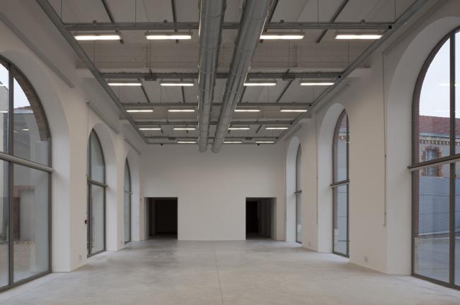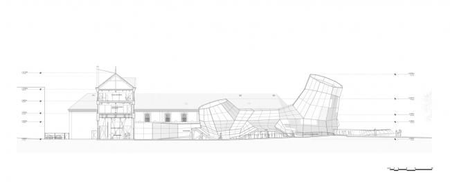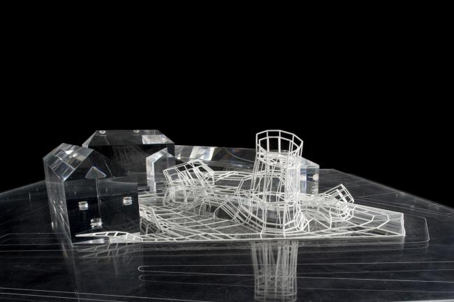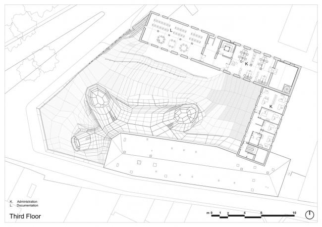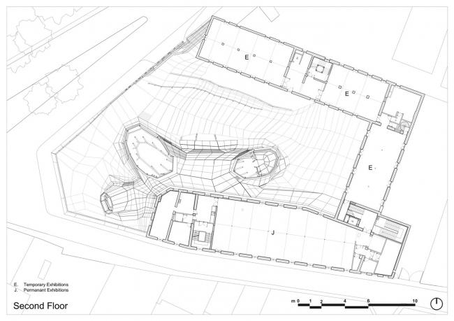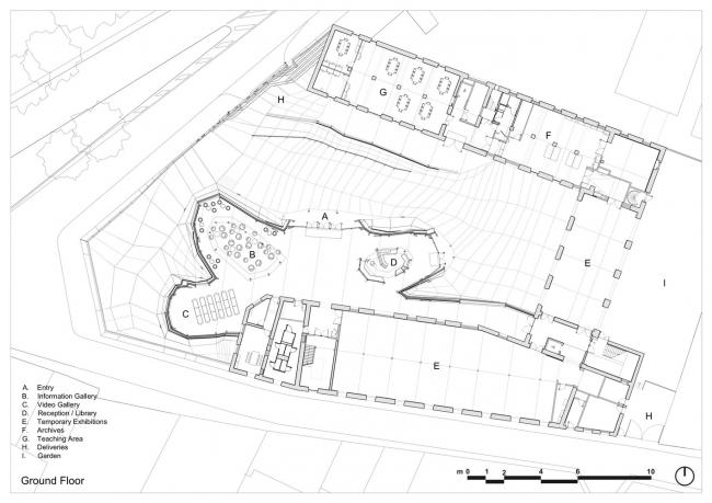 这些“扭转的体量”的挤压形态各自包含该区域的功能元素:例如第一个和最高的体量作为临时展览画廊及其附带的景观空间而使用,最小的作为视听画廊,第三个则是入口大厅,包含一系列的零售空间和气氛愉悦的公共社交空间,延伸至室外的庭院之外。这个中心空间是一个交汇点,同时也是供人们会面和交流的场所,处于建筑物质和非物质的过渡空间。并且作为动态空间引导公众与人流进入这个临时和永久的展览空间和研究区域,进行一定的探索体验。