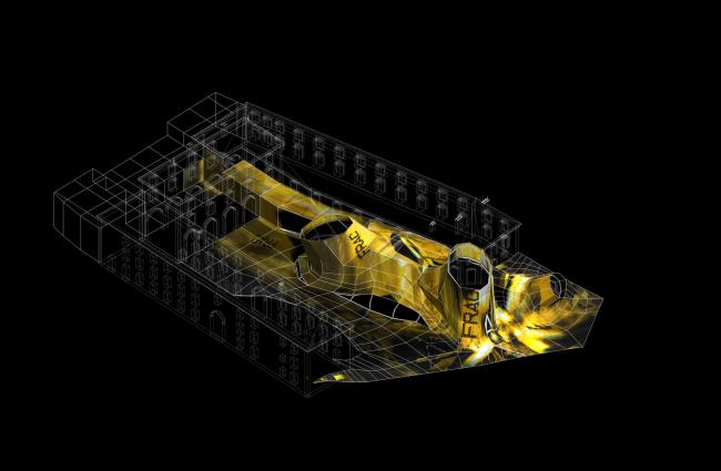 内外部空间的表皮设计与介入是由精致的金属质感和定制的网状纺织材料共同作用达成的,它们在一定程度上传达了永久变动的信息流状态。我们的设计想法是创建一个能够处在不断描述变化的创作过程建筑,而同时又讲这些隐匿于表皮的这些线条后面,这些线条只是为了重新出现在体量制中,以参数话的三维图像,建筑的具象化形式来表达出来的。体量,光线和图像共同作用产生影响融合在一起,创造出动态的信息流架构形式。