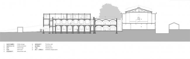设计将储藏咖啡豆的仓库(BIM培训)置于底层,以十字砖拱的形式来营造重质的、包裹感的、幽暗的、具有地窖氛围的空间,厚重的体积同时回应恒温恒湿的物理要求。