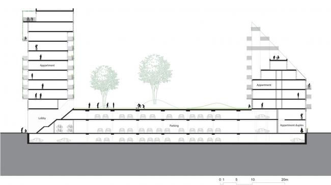 这座“房子”在小岛的中心地带形成了一个外部延伸,打破了其他建筑物的相对排列形式,并在街道上安排了一个开口。这块巨大的混凝土板形成了几个绿色的梯田式露台,可以将它们看做是能够俯瞰内部庭院的大空间。主体量由绿色金属面板组成,与“花园”的室内的功能呼应。