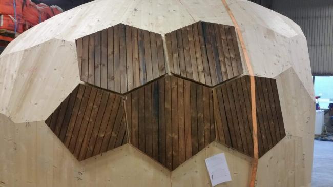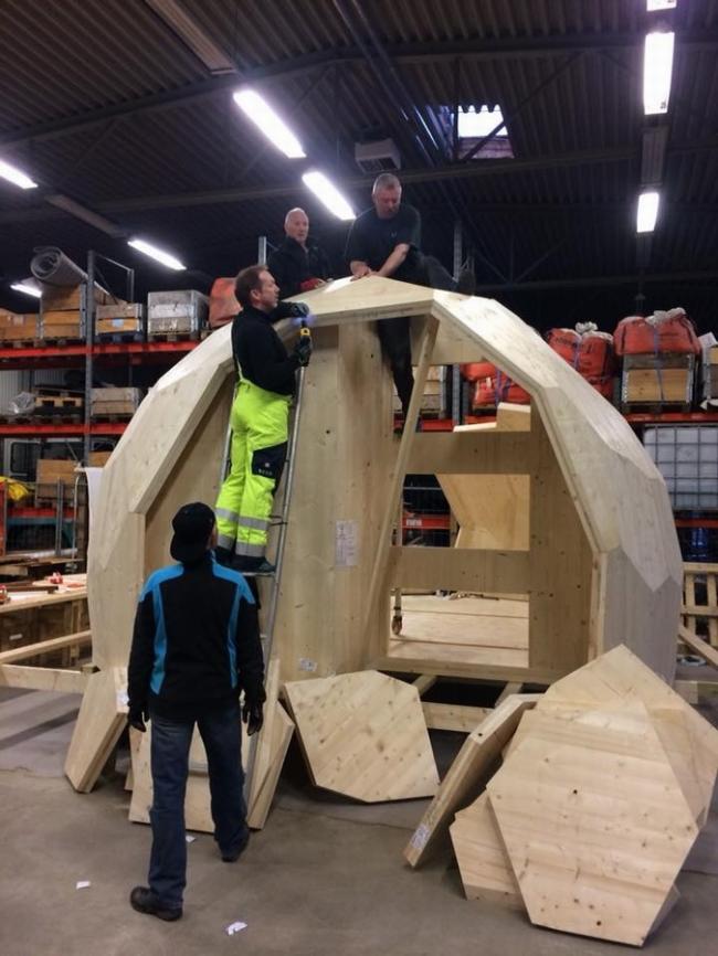 最后,决定在可控的仓库环境中来搭建结构,在那里组装集合并完成进行些部分测试,然后卸载部分构件以便运输过程的便利性。一组热情的志愿者在4个工作日内就将预制的CLT面板的主要结构安装在一起。另一组负责根据SPINN的1:1图纸切割,测量外表面的框架和面板的组装。志愿者在建造一个小屋时使用了超过1500小时,外加两个外立表层的组装。该项目唯一的较专业行的建筑工作是壳体的双层沥青防水涂层,以及建筑工人在现场浇筑的基础等等。