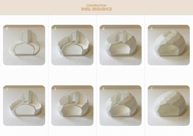SPINN迎接了挑战并在2015年夏天开始了最初的草图设计。“Varden”被认为是一种适合当地地形的有机木结构,可以承受该地区极端恶劣的冬季气候条件,为徒步旅行者提供温暖和宜人的休息环境,自身也能够成为当地一个极具吸引力的景观而存在。为了将有机木壳的草图转化为现实,SPINN联系了他们的长期合作伙伴FORMAT工程师,帮助他们将双曲木“岩石”转变为一种结构,该结构可以按照预期被精确地制造出来,然后由一群人建造在山顶上当地志愿者使用无人机和摄影测量软件在3D中绘制这些位点,以给出表面的详细设计图纸,该图用作建筑形态形成的一个个基线。