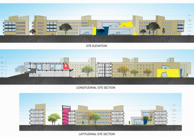 建(BIM教程)筑物的有机布局是该场地内每个空间的特征风格。项目的颜色色调有着分明和强调了不同色带的体块和设施功能。每个街区都以不同颜色的宿舍凸窗表达鲜艳色调为主,以创造一个鲜明的认知风格。