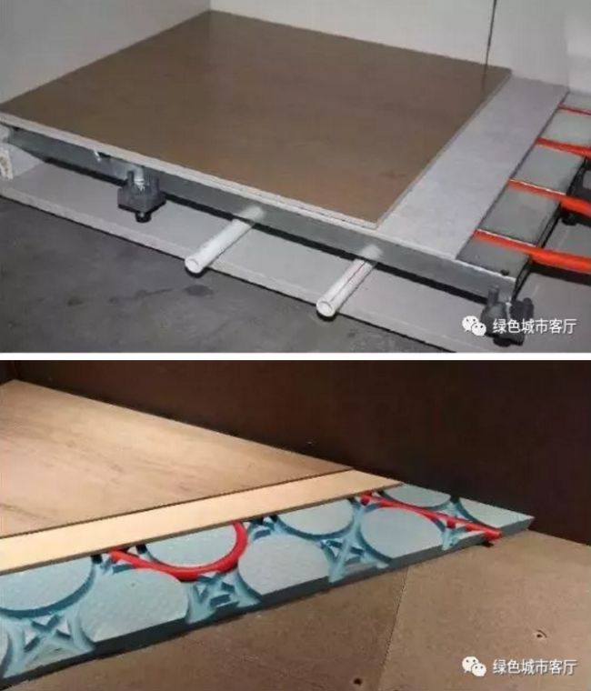 模块化快装地暖——埋地暖气管线固定在规划好的地槽中,地面架空层在暖气管线上采用过桥板工艺,实现干法施工的暖地面。