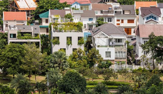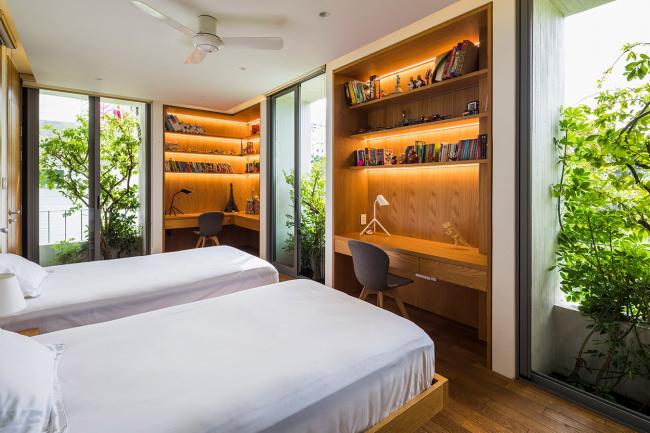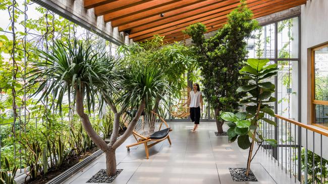 “走过这个空间,人们会感觉到自然风从起居室缓慢流动到房子的顶层,而绿色的外观设计则在一定意义上缓解了热带气候的暴烈阳光。该建筑的模型设计是越南亚热带气候居住住房的一个特别先例,”建筑师这样说明道。