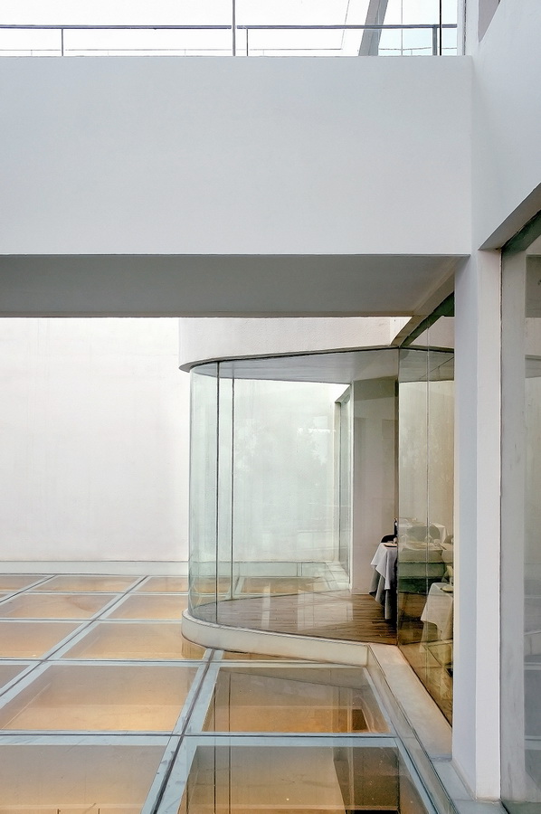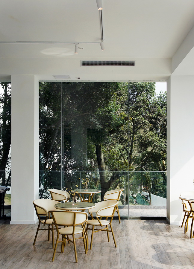 餐厅空间我们希望能是尽量通透的,所以我们给它的中部一个室外的天井,这使它的平面形成了一个“回”形,使用者能最大限度的感受自然的环抱和极目远眺的视野。