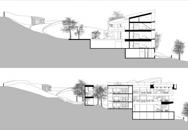 项目地块位于山的南岸,南北地形高度落差约有13米,入口在北侧,南侧树梢以上远眺视野极佳,所以利用好地形的高差和最佳视角是我们第一步要做的事。