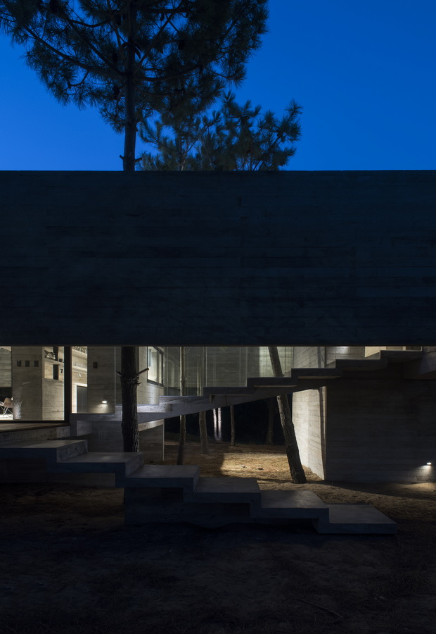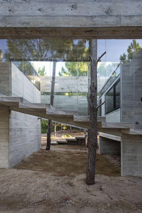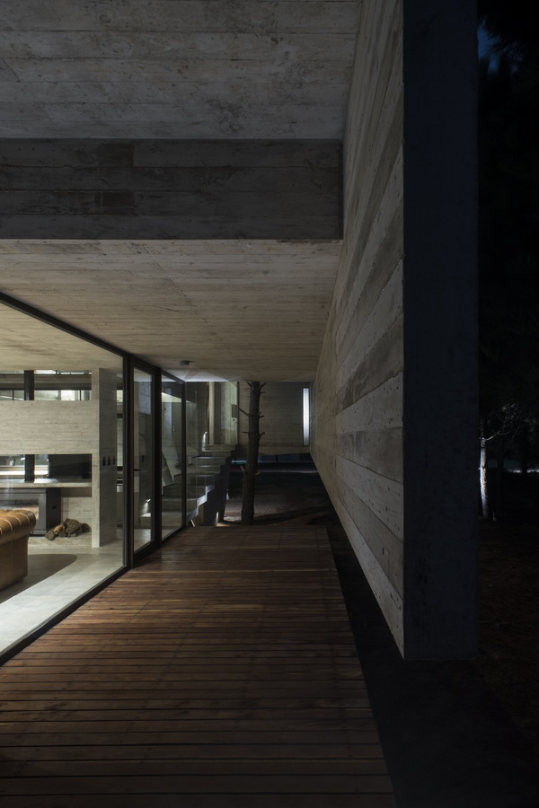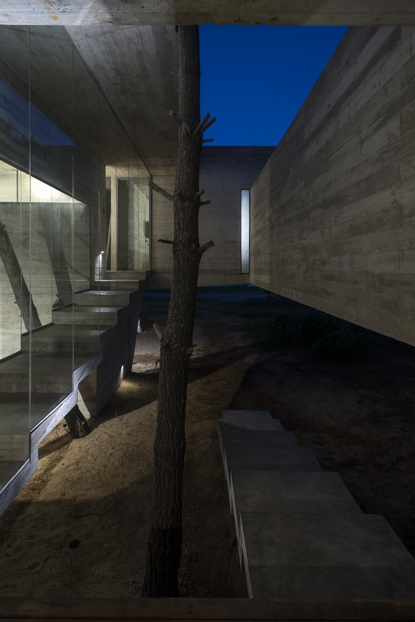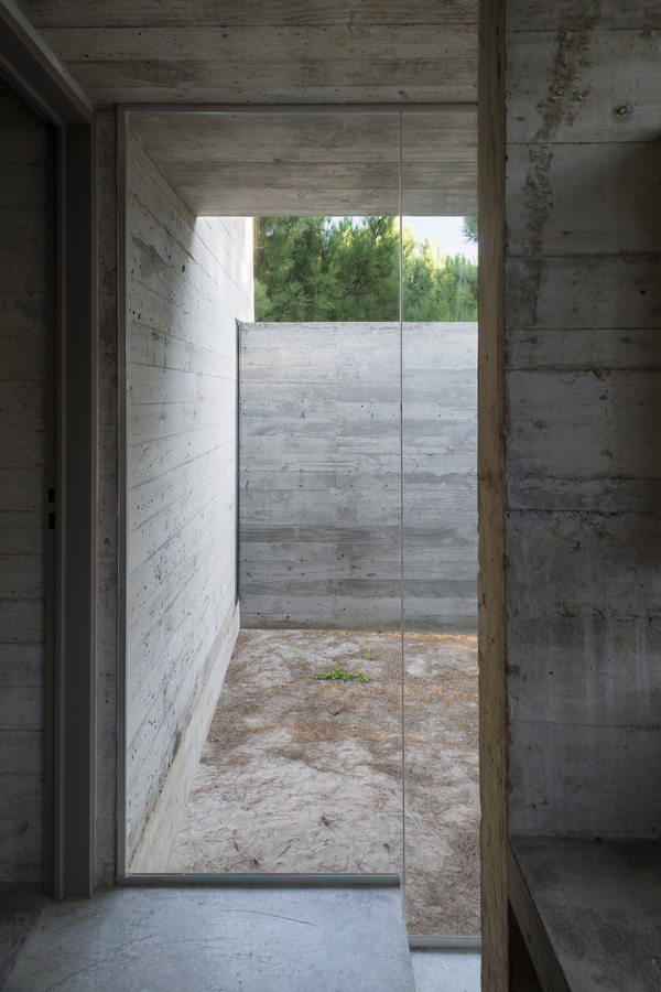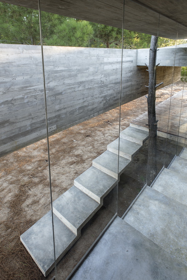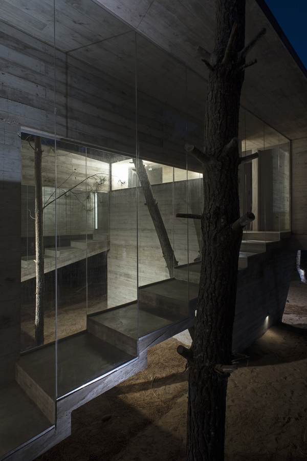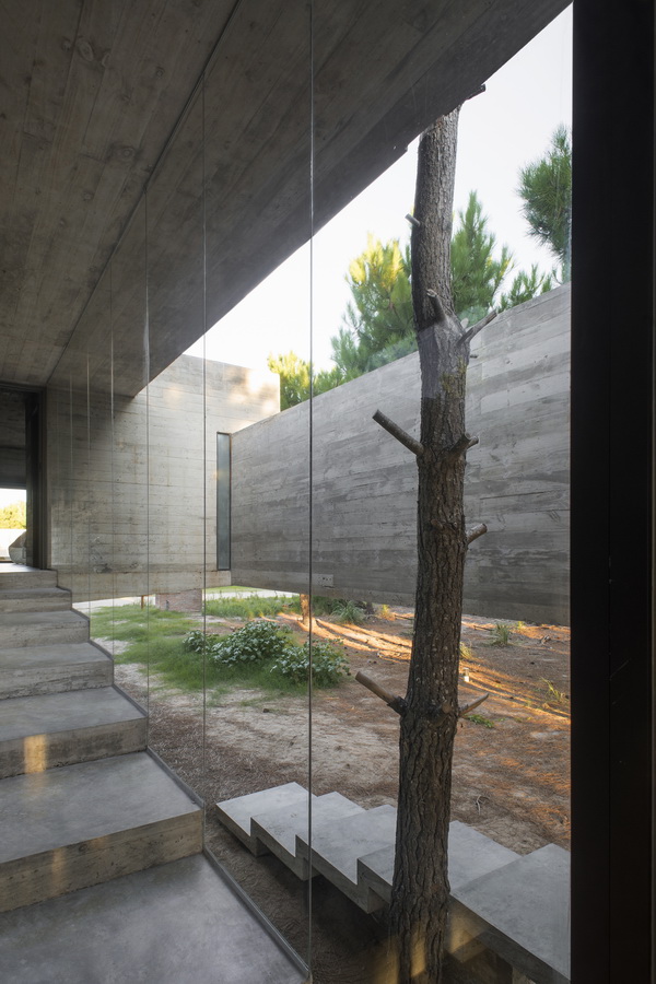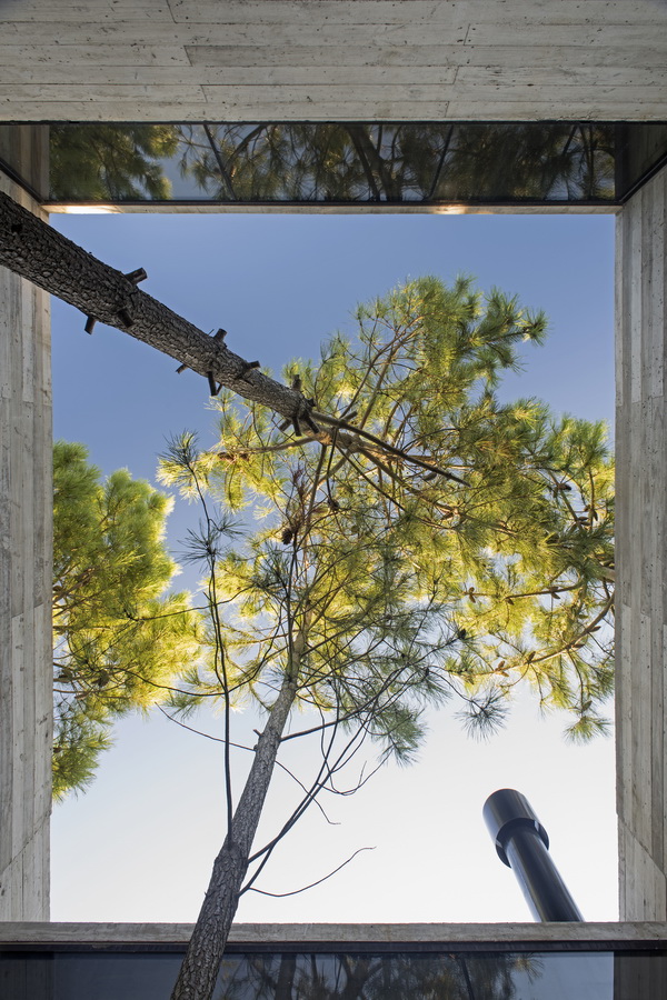 连接两个平台的玻璃桥穿过一条松树环绕的长廊,在长廊上,光线从屋顶落下,洒落在树枝上。这样,森林的生命力就被引入了房子。外墙和内隔墙都是由清水混凝土制成,地板则是由光滑的混凝土制成。